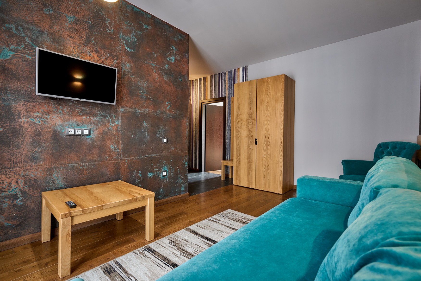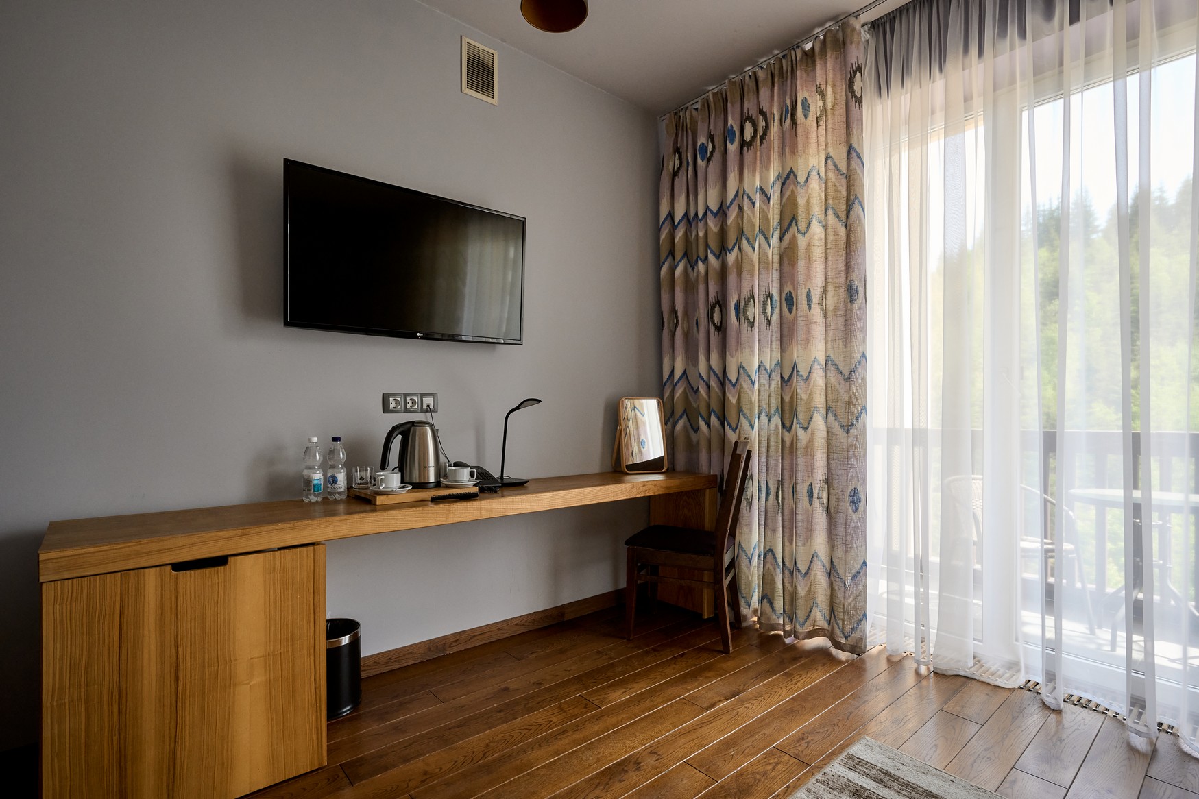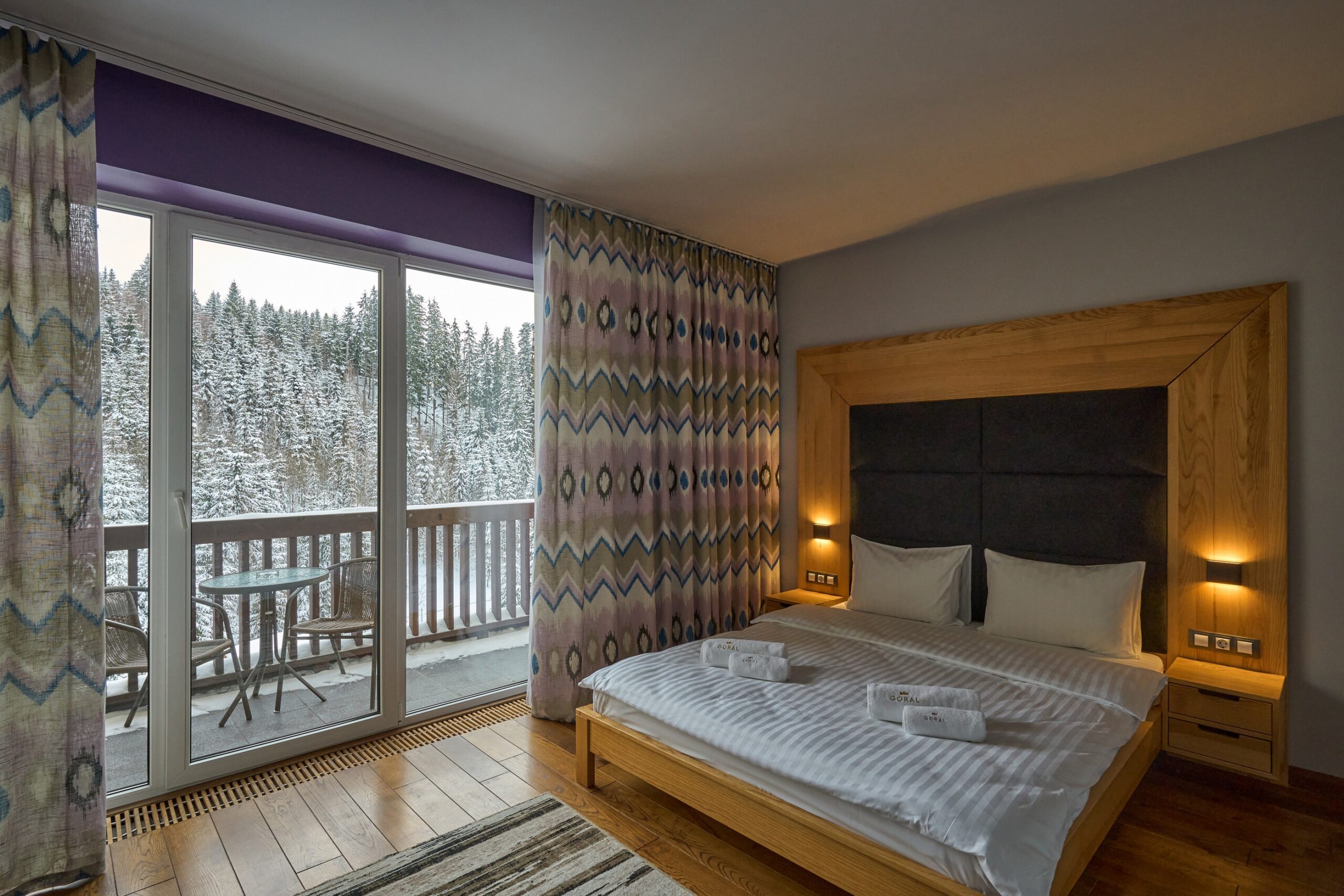 Двокімнатний номер оформлений у сучасному стилі з 1 двоспальним ліжком та двомісним розкладним диваном з видом на ліс та гори.