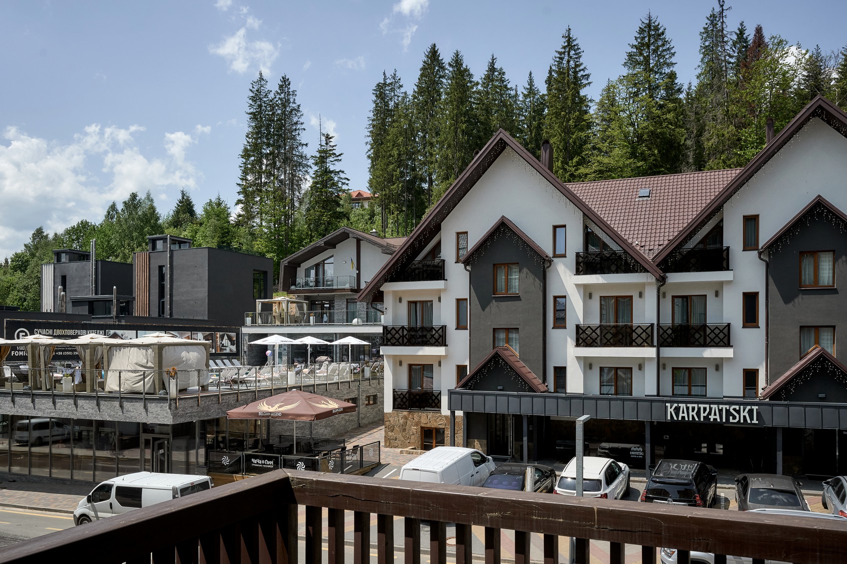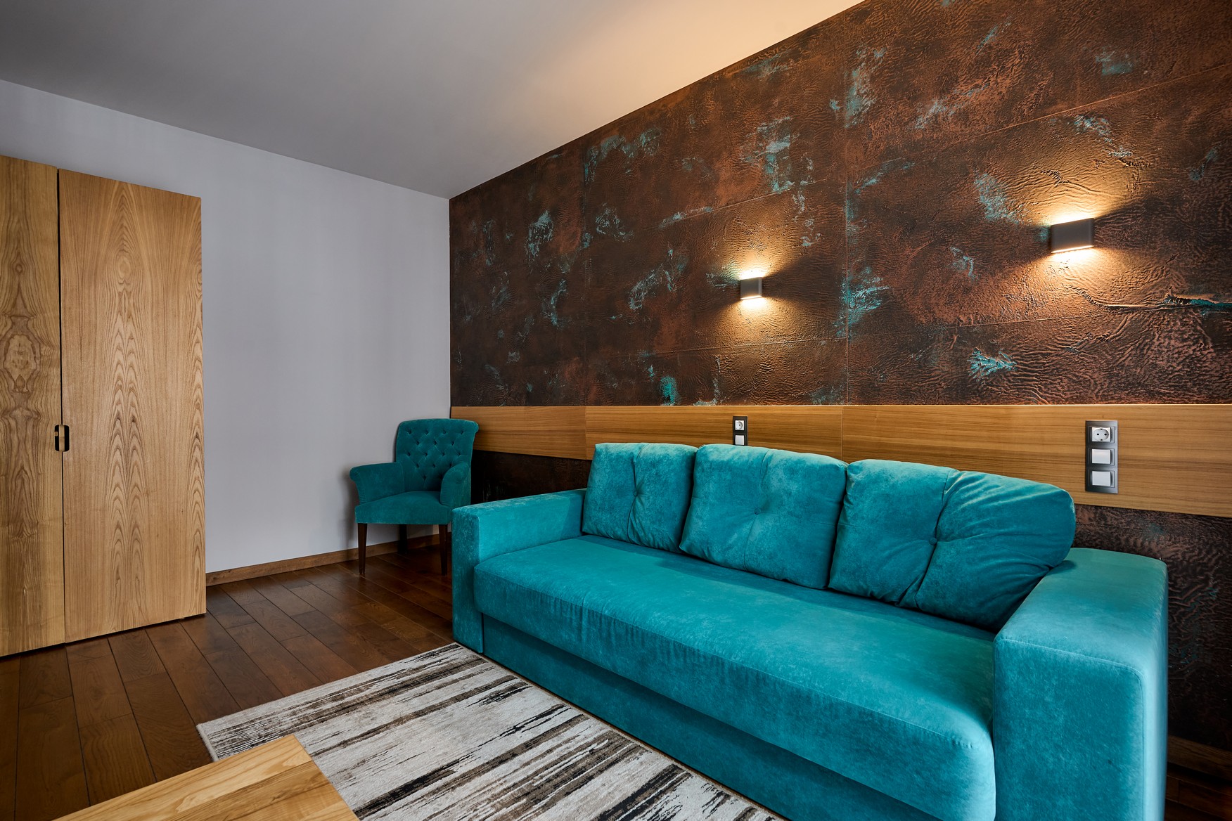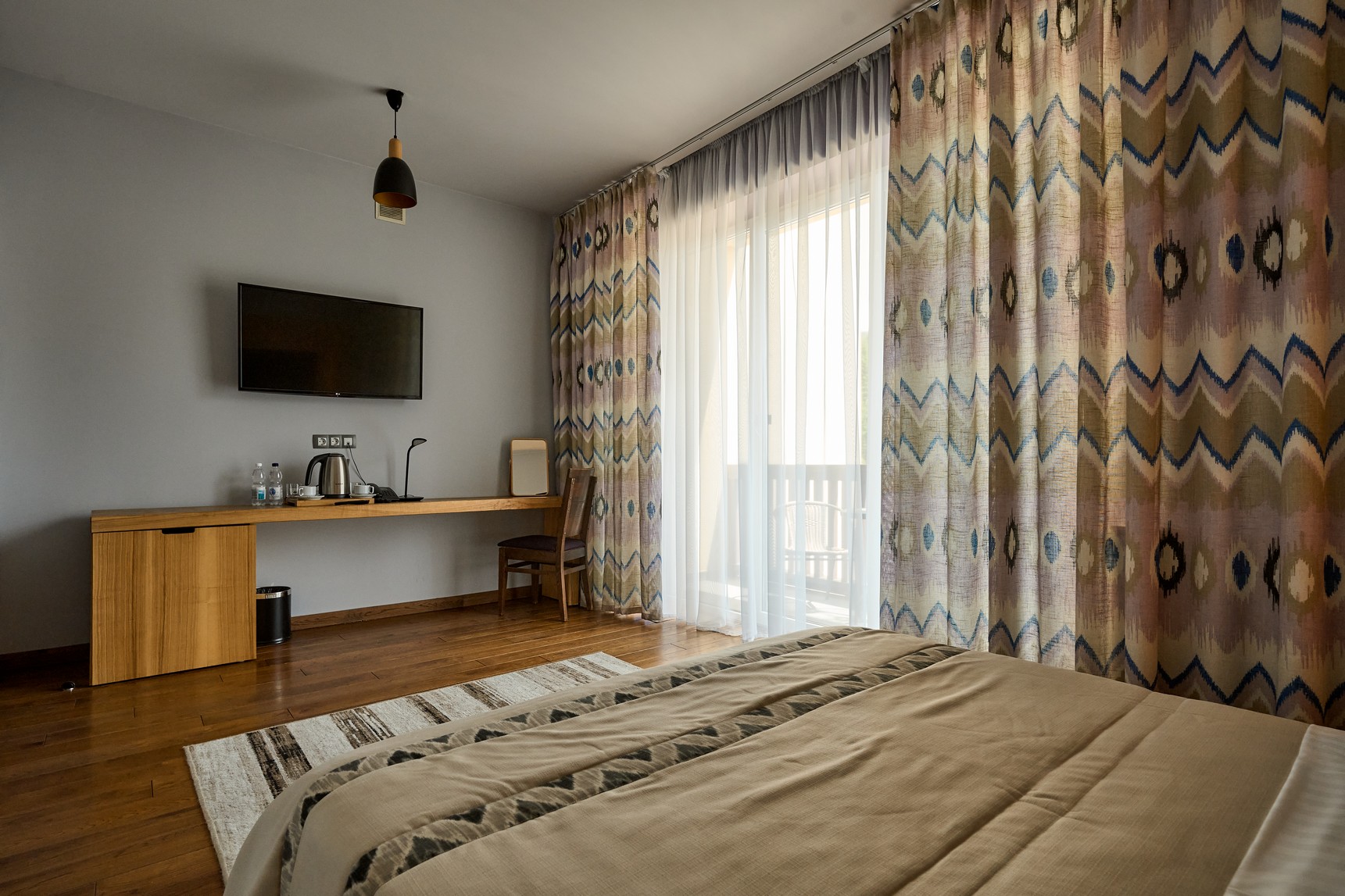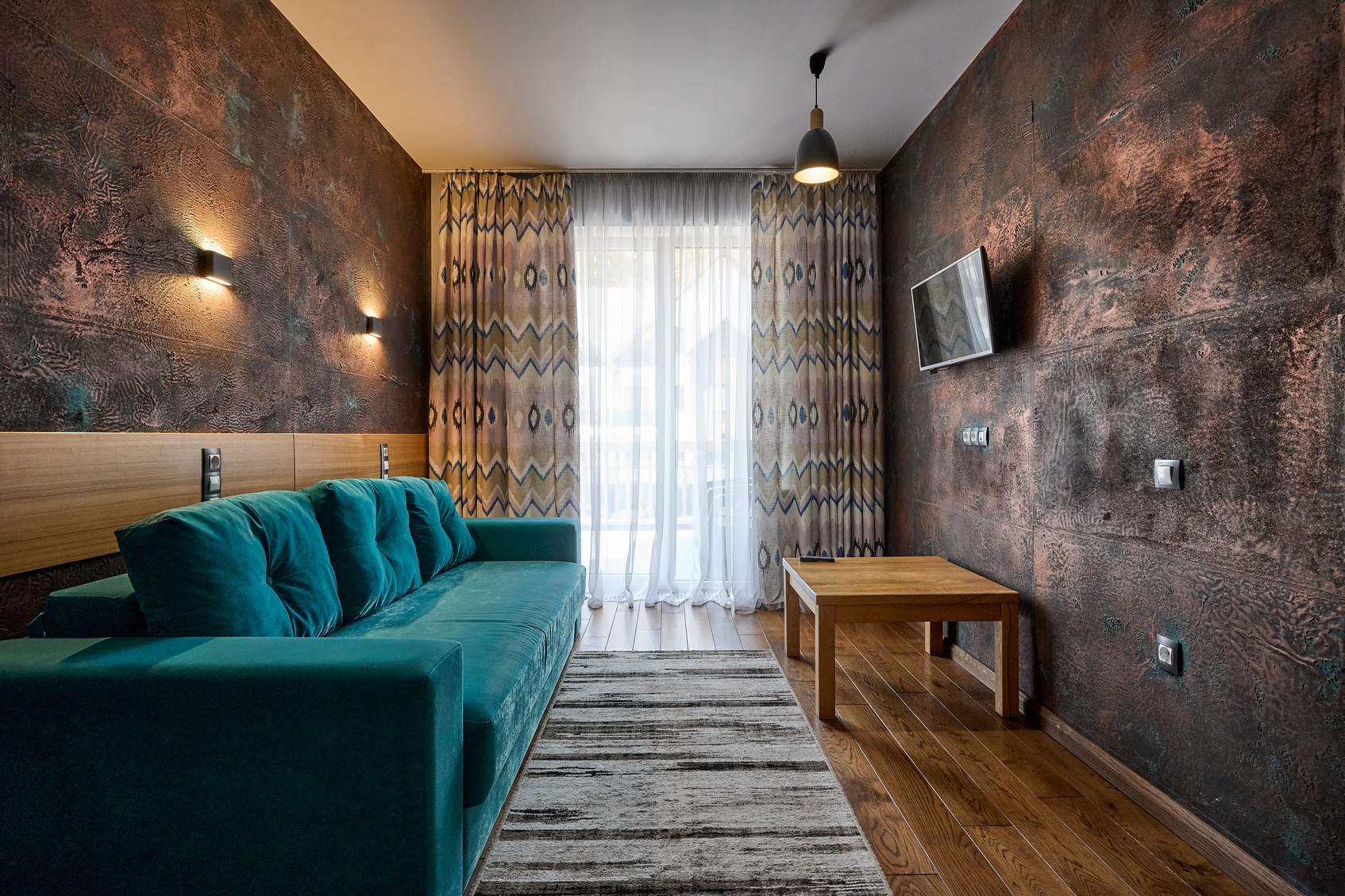 Двокімнатний номер оформлений у сучасному стилі з 1 двоспальним ліжком та двомісним розкладним диваном з видом на ліс та гори.