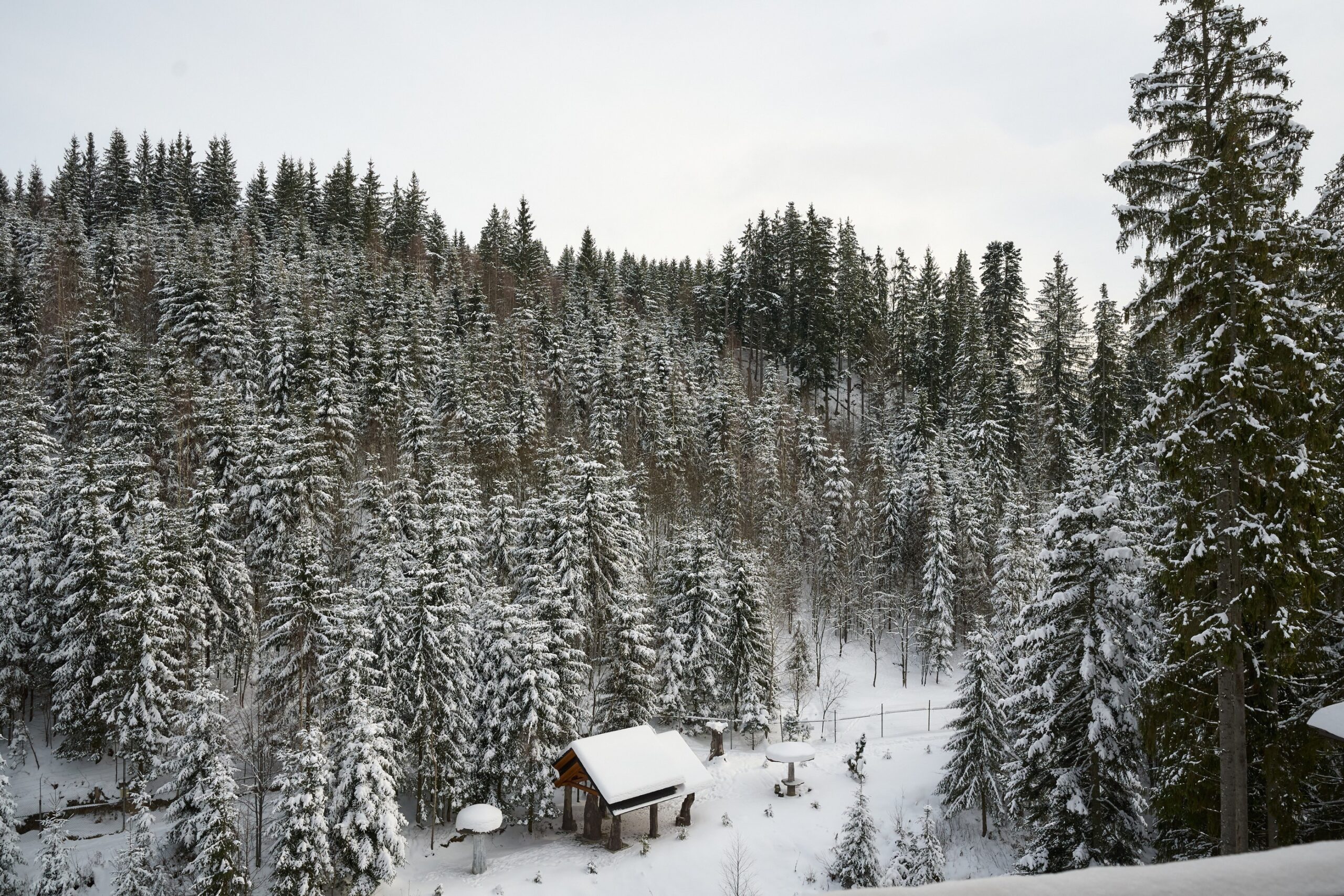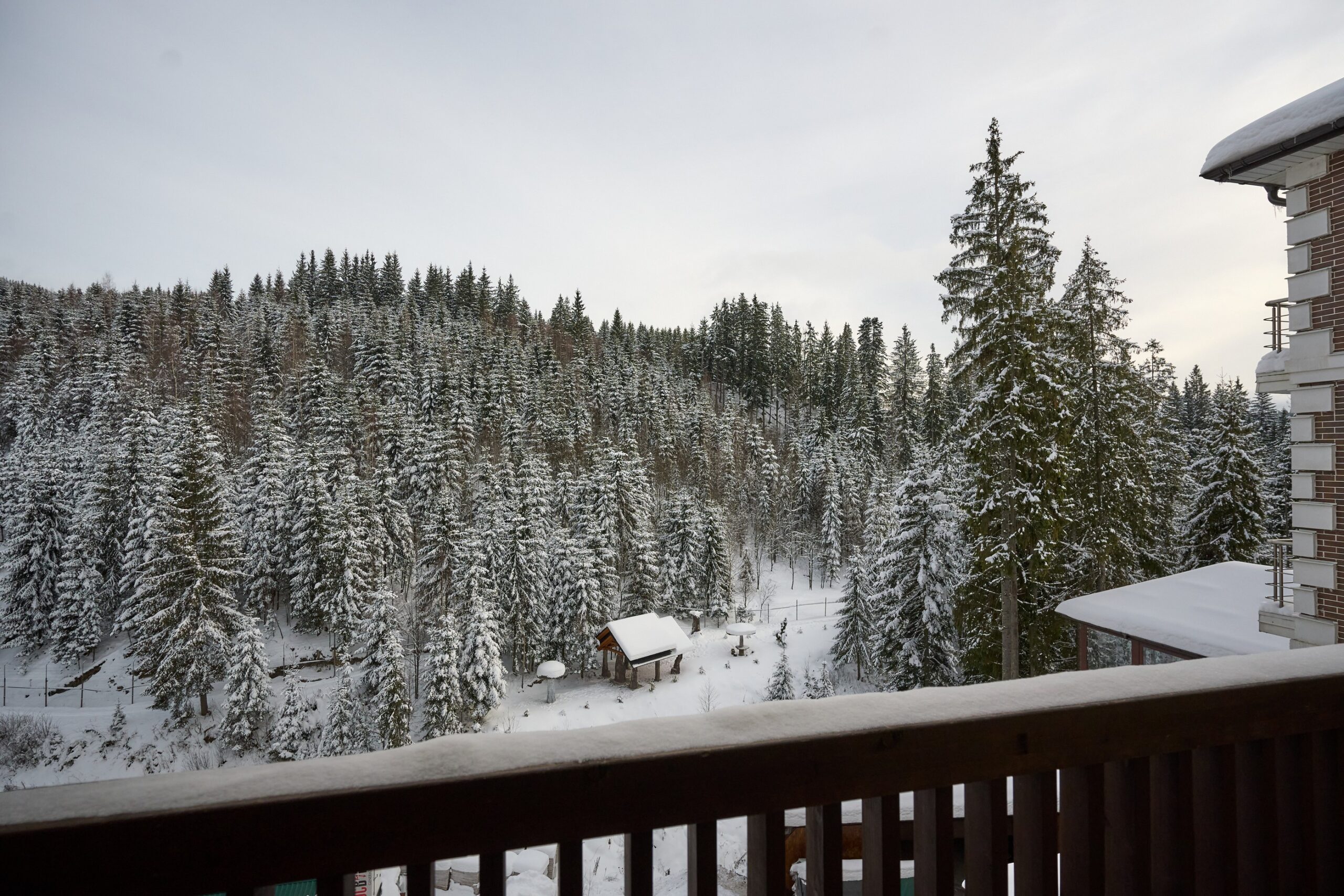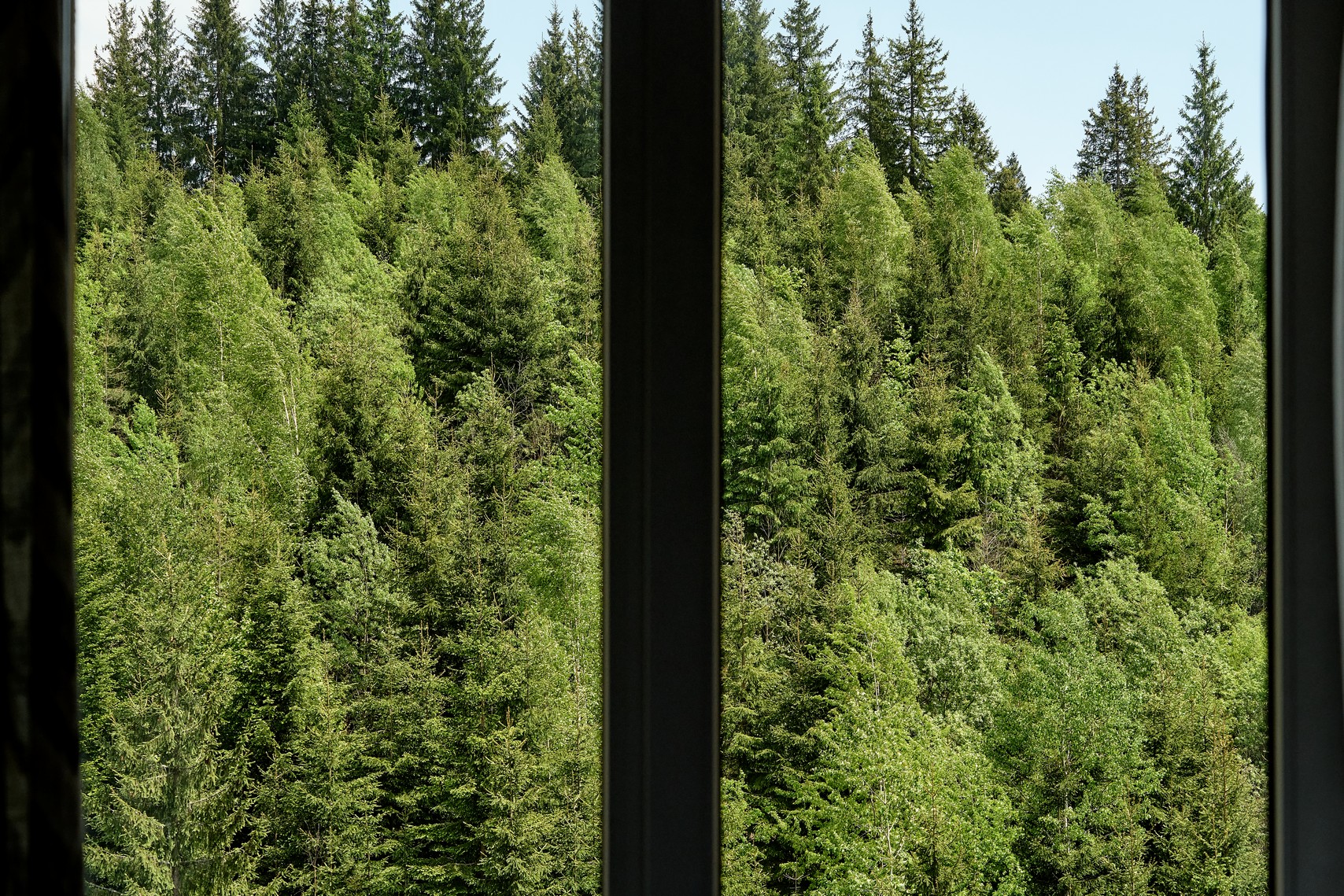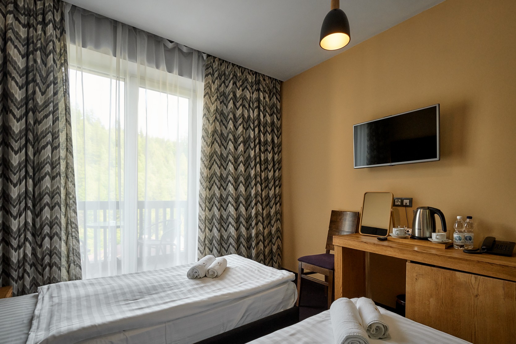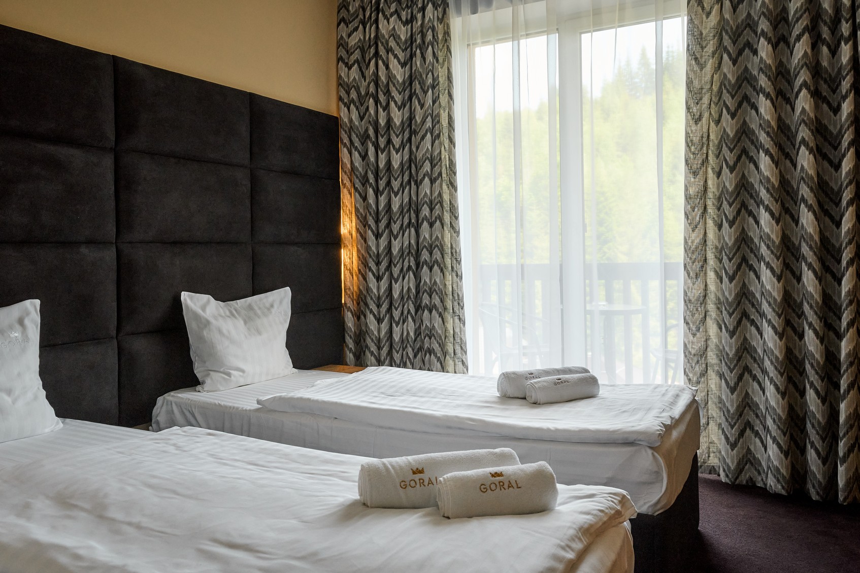 Номер оформлений в сучасному стилі з 2 односпальними ліжками з видом на ліс та гори.