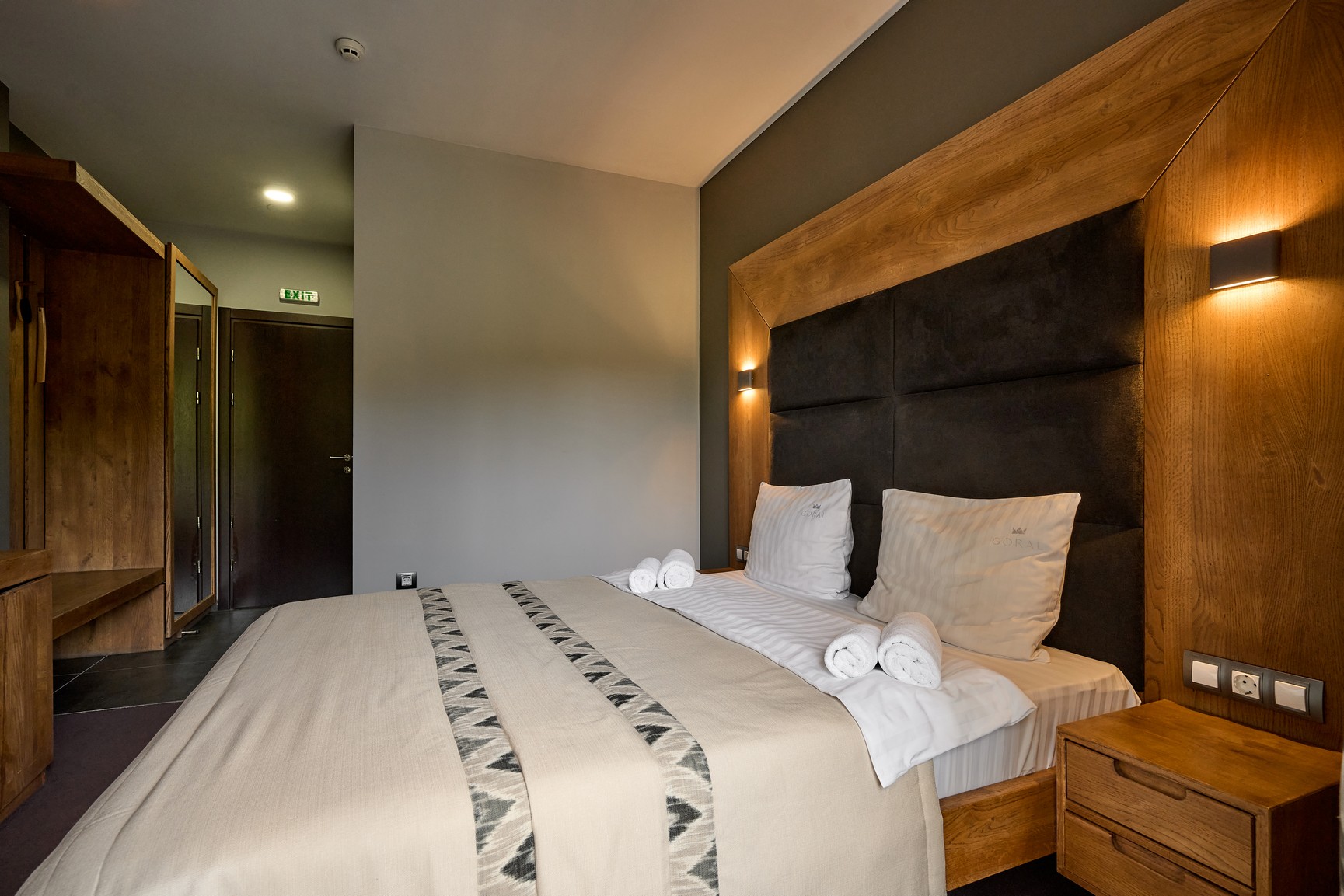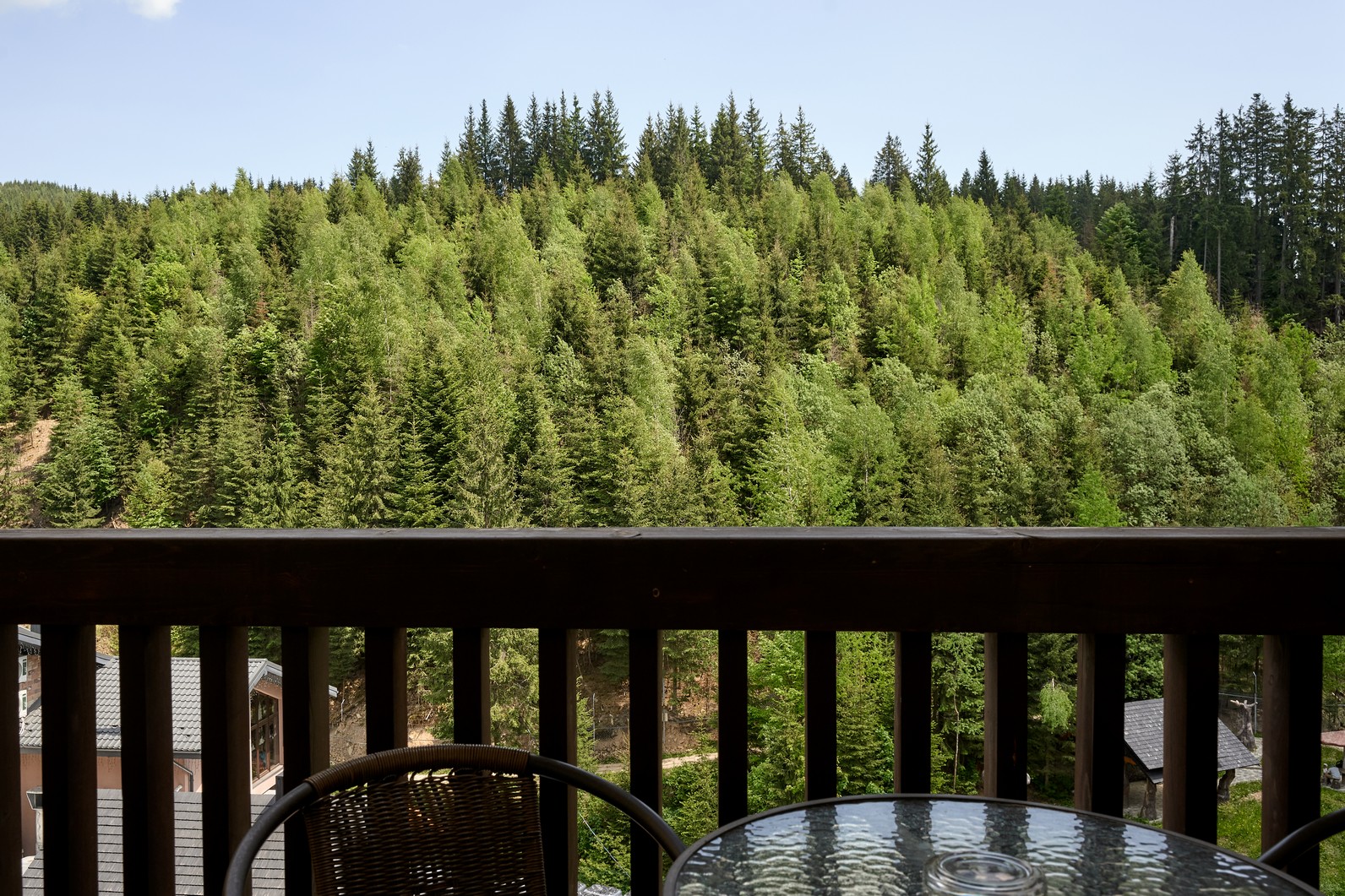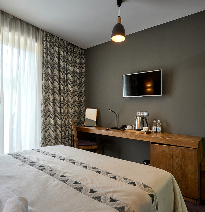 Номер оформлений в сучасному стилі з 1 двоспальним ліжком з видом на ліс та гори.